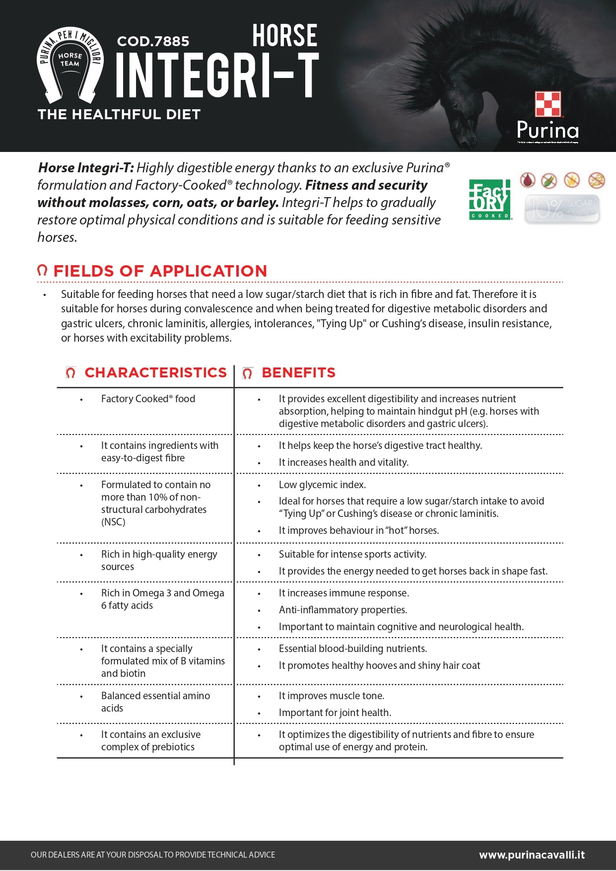 Posebna krmna mešanica primerna za vse občutljive konje. Brez melase, brez koruze, brez ječmena in brez ovsa. Brezžitno krmilo, posebej oblikovano za konje z inzulinsko resistenco, laminitike, konje z ranami na želodcu, alergijami, metabolnimi težavami (Tying up, Cushing). Ekskluzivna Purina formulacija in tehnologija Factory-Cooked®.